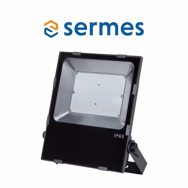Projecteur LED 50W – 6600lm – 5000K – IP65 – IK09 / Projecteurs extérieurs / Sermes / Lamdalux / First / 31211390 / First Proj 50W / Projecteur avec corps en aluminium moulé sous pression et étrier en acier laqué de coloris noir RAL 9005. Réflecteur en aluminium anodisé mat. Verre trempé clair. / P000001252