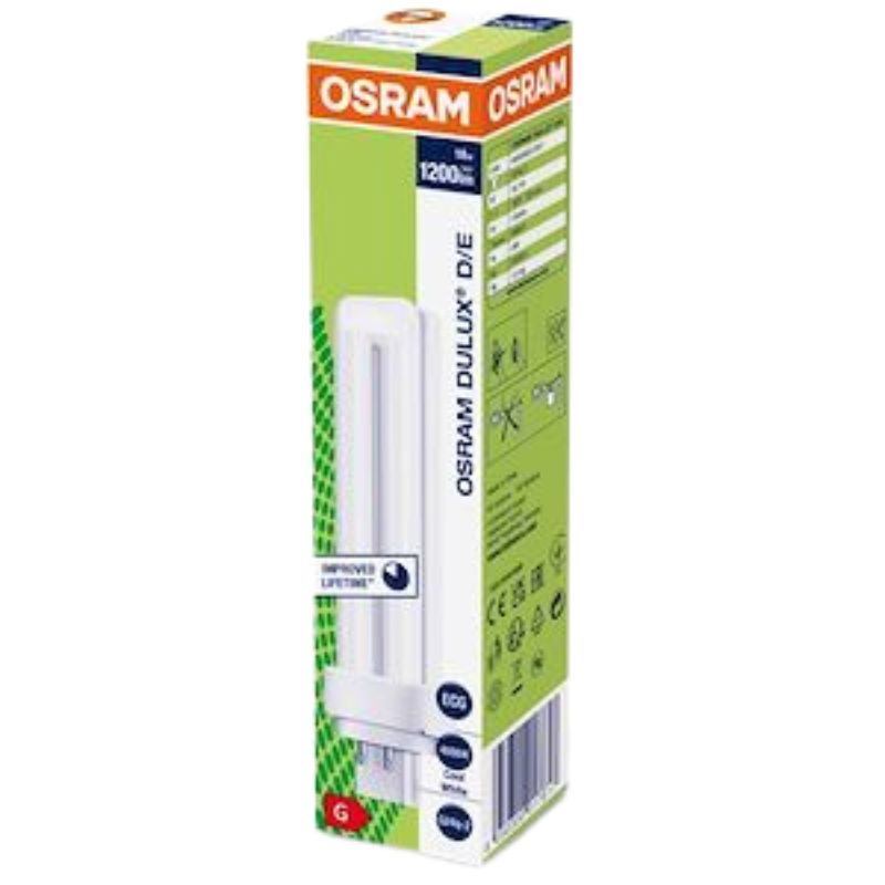 Ampoule Fluo G24q-2 – 18W – 1200lm – 4000K / Sources lumineuses / Osram / DULUX® D/E / 017617 / OSRAM DULUX® D/E | Lampes fluocompactes à alimentation séparée, 2 tubes, culot 4 broches, pour alimentation électronique / Vente par lot de 10 pièces minimum / P000001590 / 4050300017617